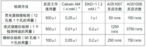 *1: The number of reactions in this kit is calculated as one reaction of 500 μl of working solution in one well of a 12-well plate for fluorescence microscopy. The number of reactions for different detection methods is calculated in the following table: