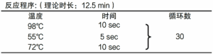 以 λDNA 为模板,添加不同模板量(5 ng、1 ng、100 pg、10 pg、1 pg、100 fg),采用本试剂盒扩增 4 kb DNA 片段,模板量低至 100 fg 时,能以 5 sec / kb 的延伸速度扩增出目的片段。