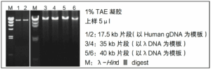以 Human gDNA(泳道 1~2)为模板,可扩增 17.5 kb 的 DNA 片段;以 λDNA(泳道 3~6)为模板,能够很好地扩增 40 kb 的 DNA 片段。