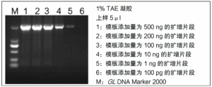 以 Human gDNA 为模板,添加不同模板量(500 ng、200 ng、100 ng、10 ng、1 ng、100 pg),采用本试剂盒扩增 2 kb DNA 片段,模板量低至 1 ng 时,能扩增出目的片段。