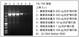 以 Human gDNA 为模板,添加不同模板量(500 ng、200 ng、100 ng、10 ng、1 ng、100 pg),采用本试剂盒扩增 4 kb DNA 片段,模板量低至 1 ng 时,能扩增出目的片段。