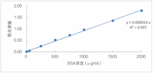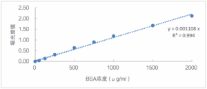 1、本产品灵敏度高,线性范围广泛,吸光值在 5 ~ 2000 μg/ml 蛋白浓度范围内具有良好的线性关系,但是不同蛋白检测的浓度下限可能会有区别。